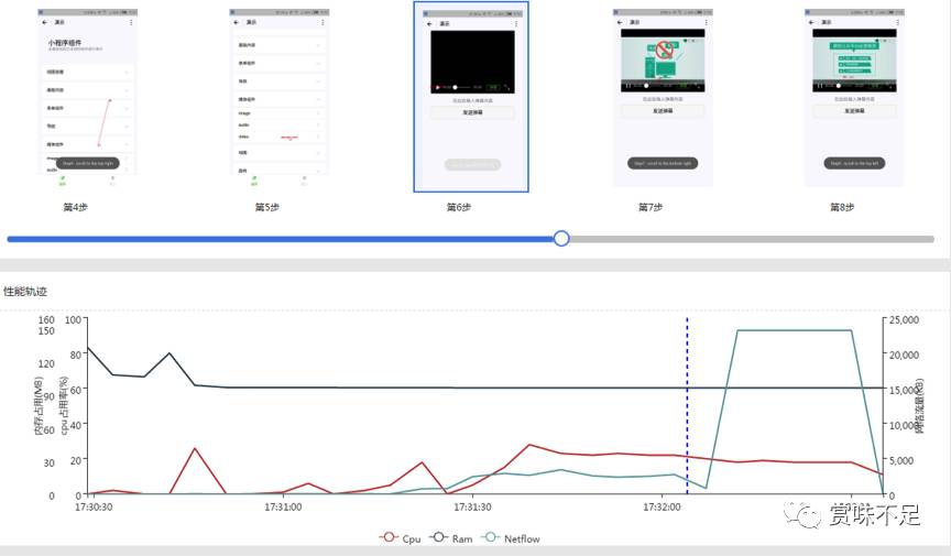 上圖是用Xtest進行多機聯(lián)測后一臺設(shè)備的性能數(shù)據(jù)展示。從截圖可以看到當進入小程序的視頻界面開始播放后(第6步),曲線圖的紅色線(CPU)開始斜坡上升,隨著視頻加載緩存(第7、8步),代表上下行流量的綠色線(NetFlow)開始陡增。嗯,還是比較符合人類宏觀認知理論的。如果配合腳本的場景編寫,應(yīng)該很容易就可以完成壓測中的性能數(shù)據(jù)收集,并根據(jù)圖片手順定位哪步操作會導(dǎo)致性能數(shù)據(jù)異常。