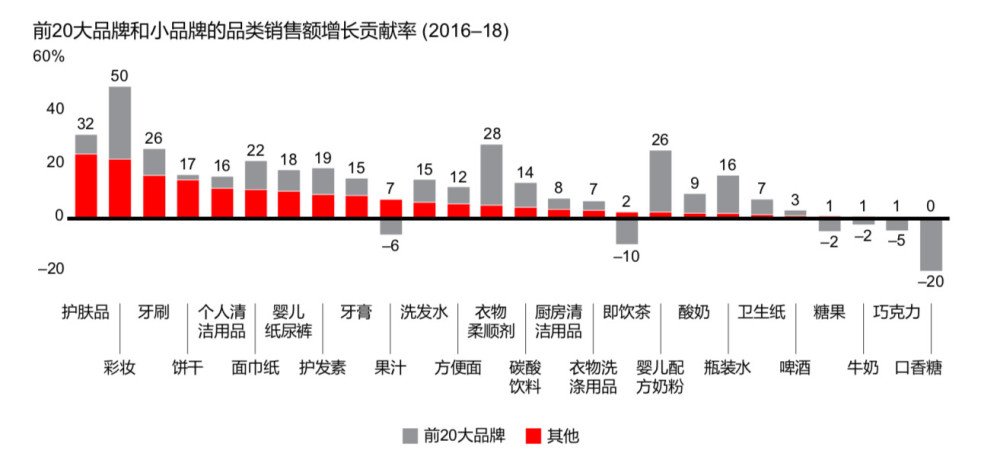 例如,在護(hù)膚品類,前20大品牌僅占該品類銷售額增長(zhǎng)的9%,而小品牌占據(jù)了近1/4。個(gè)人清潔用品和餅干的情況更為顯著,前20大品牌對(duì)品類銷售額增長(zhǎng)的貢獻(xiàn)分別為5%和2%,而小品牌則分別為11%和15%。