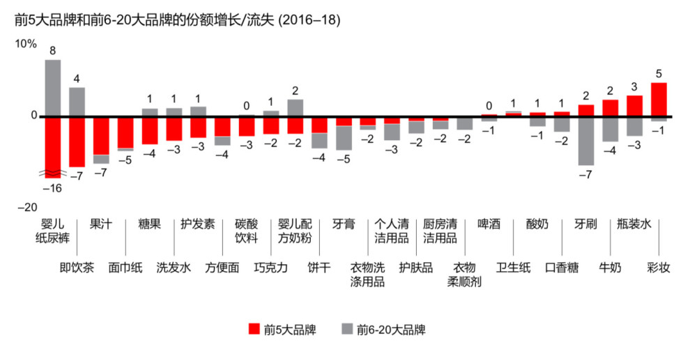 大部分品類的前5大王牌品牌,三年內(nèi)都面臨市場(chǎng)份額流失的挑戰(zhàn)——例如,嬰兒紙尿褲流失16%、即飲茶流失7%、果汁流失6%。