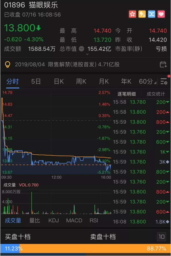 同時,中金公司近日發(fā)表報告指出,上半年中國內地實現(xiàn)票房311.7億元人民幣,同比減少2.7%,九年來首次同比下滑,電影行業(yè)已進入“后紅利”時代。報告認為,中國電影票房收入整體疲軟拖累貓眼娛樂的售票收入,下調其目標價26.6%至19.3元。截止今天收盤,貓眼股價大跌。