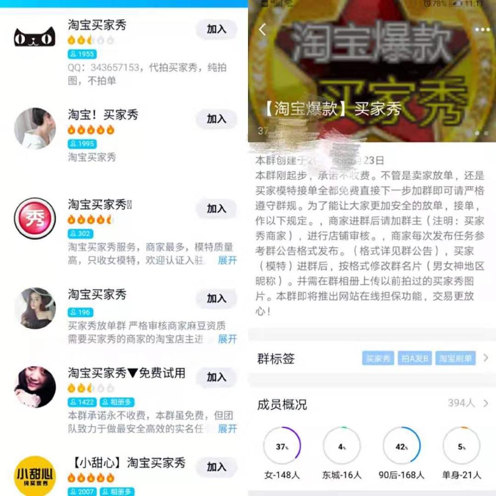 記者以“淘寶買家秀”為關(guān)鍵詞在QQ群查找,可看到數(shù)百個相關(guān)群組。據(jù)了解,大部分相關(guān)群組都能提供賣家放單及買家接單等資源對接,側(cè)重于打造爆款、提升店鋪權(quán)重。