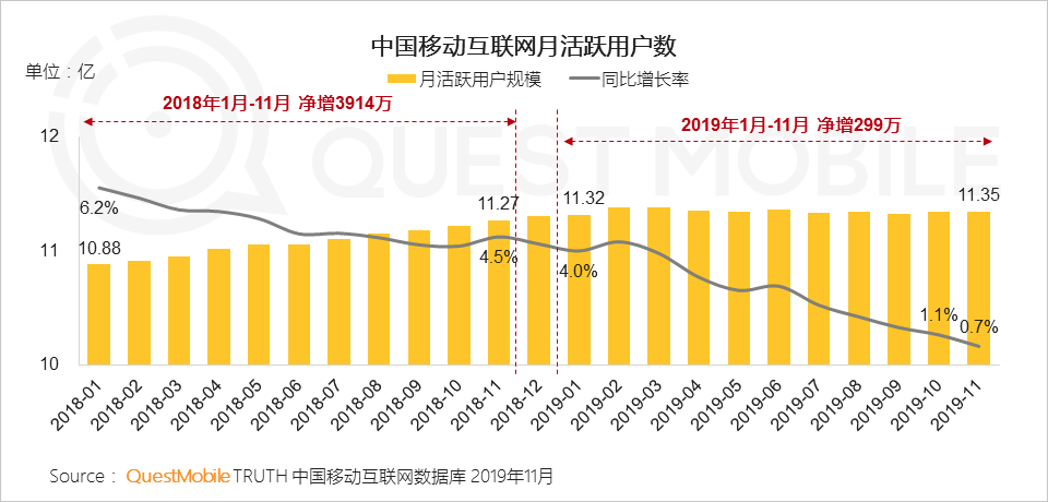 經(jīng)過(guò)了多年發(fā)展,過(guò)去幾年,移動(dòng)互聯(lián)網(wǎng)的大盤增長(zhǎng)不斷放緩,目前已經(jīng)觸及天花板。根據(jù) 1 月 8 日 QuestMobile 發(fā)布的《2019 中國(guó)移動(dòng)互聯(lián)網(wǎng)八大關(guān)鍵詞》,2019 年全年互聯(lián)網(wǎng)大盤用戶增長(zhǎng)不足 300 萬(wàn),同時(shí),三分之二的細(xì)分行業(yè)頭部 App 已經(jīng)聚攏了超過(guò)半數(shù)的行業(yè)用戶。