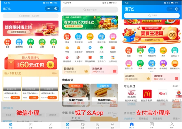 比如餓了么外賣,其App底部導(dǎo)航欄有四個(gè)選項(xiàng),而小程序只有三個(gè)