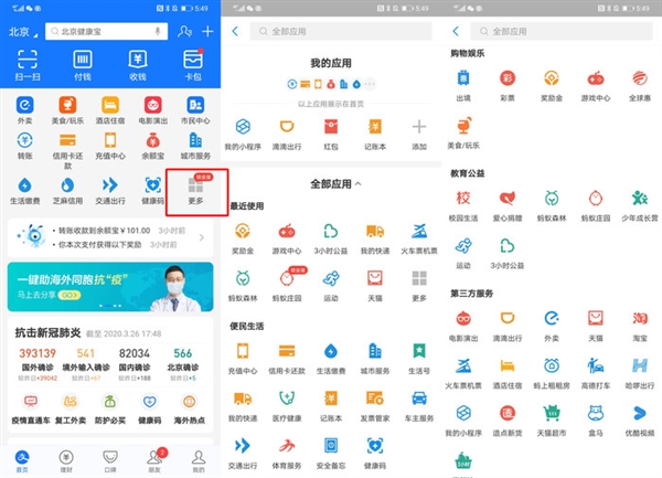 與微信小程序的(用戶)“搜"、(好友)"傳"等模式不同,支付寶已經(jīng)將絕大多數(shù)涉及支付的頭部app集合在支付寶的導(dǎo)航欄上,用戶打開支付寶,多則兩三步、少則一兩步,手指“點(diǎn)點(diǎn)點(diǎn)”即可使用財(cái)富管理、購(gòu)物娛樂(lè)、便民生活等。因此大家連搜都不用搜,就可以找到很多實(shí)用的軟件。