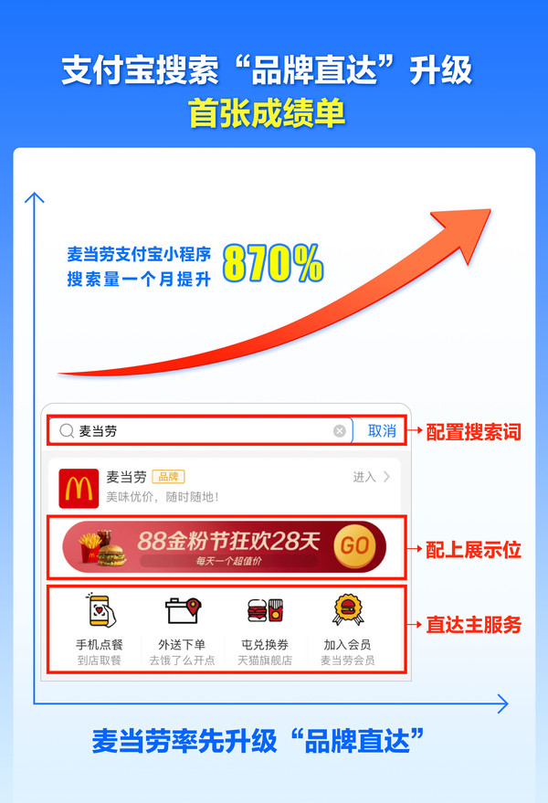 繼支付寶宣布面向全行業(yè)品牌商家開放搜索“品牌直達(dá)” 能力升級(jí)之后,8月31日,麥當(dāng)勞首張“嘗鮮”成績單出爐:通過多方位配置搜索詞、搶先試用品牌展示位和直達(dá)服務(wù)等方式,其支付寶小程序搜索量一個(gè)月增長870%。